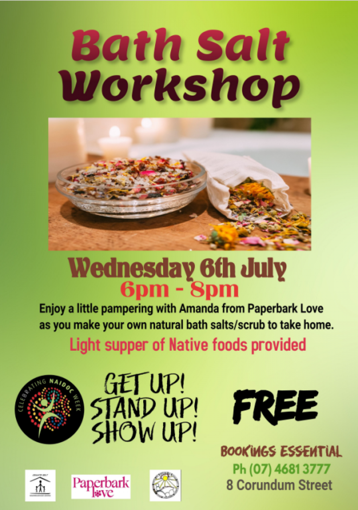 Enjoy a little pampering with Amanda from Paperbark Love as you make your own natural bath salts/scrubs to take home.